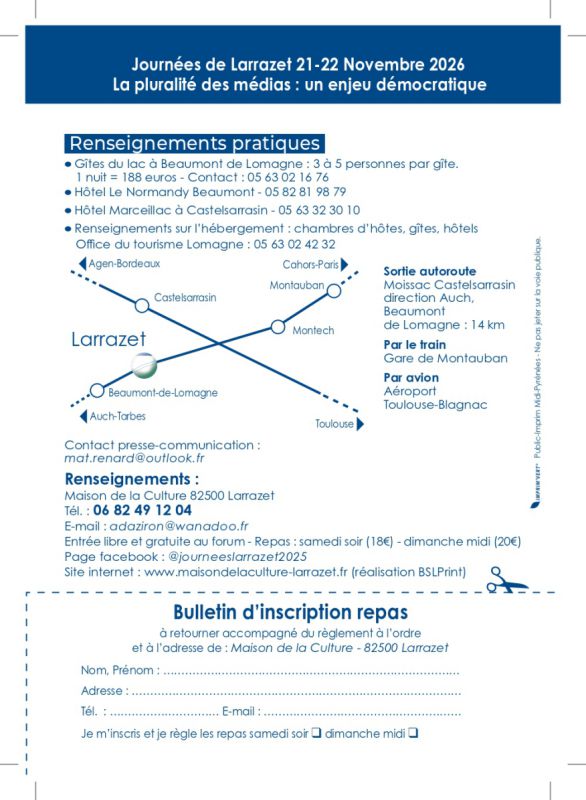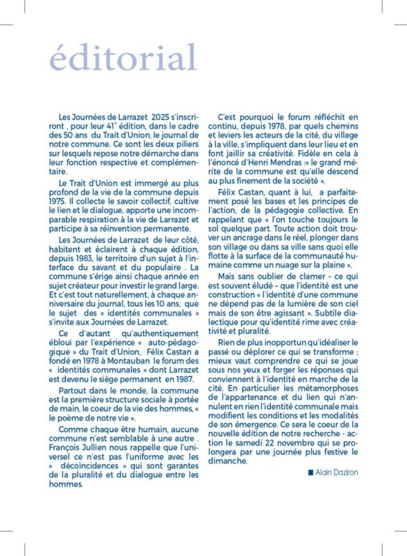 Les Journées de Larrazet 2025, qui se tiendront les 22 et 23 novembre, s’inscrivent dans le cadre de l'anniversaire du journal le Trait d’Union qui fête ses 50 ans.